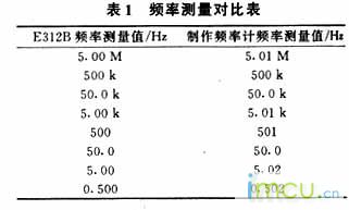 為了衡量這次設(shè)計的頻率計的工作情況和測量精度,我們對系統(tǒng)進行了試驗。以南京電訊儀器廠制造的E312B型通用計數(shù)器為基準(zhǔn),用這次設(shè)計的頻率計對信號源進行了測量,測量數(shù)據(jù)如表1所示。