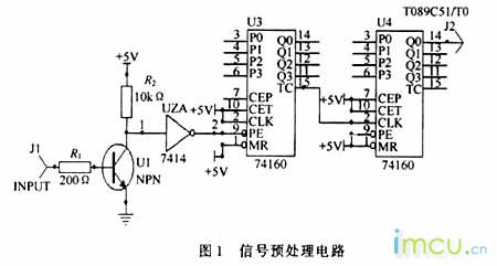 信號預(yù)處理電路如圖1所示,他由4級電路構(gòu)成。第1級為零偏置放大器,當(dāng)輸入信號為零或者為負(fù)電壓時,三極管截止,輸出高電平;當(dāng)輸入信號為正電壓時,三極管導(dǎo)通,輸出電壓隨著輸入電壓的上升而下降。零偏置放大器可把正負(fù)交替波形變換成單向脈沖,這使得頻率計既可以測量脈沖信號的頻率,也可以測量正弦波信號的頻率。放大器的放大能力實現(xiàn)了對小信號的測量,本電路可以測量幅度≥0.5 V的正弦波或脈沖波待測信號。三極管應(yīng)采用開關(guān)三極管以保證放大器具有良好的高頻響應(yīng)。第2級采用帶施密特觸發(fā)器的反相器7414,他用于把放大器生成的單向脈沖變換成與TTL/CMOS電平相兼容的方波。第3級采用十進制同步計數(shù)器74160,第2級輸出的方波加到74160的CLK,當(dāng)從74160的TC輸出可實現(xiàn)10分頻(多個74160的級連可以進一步擴展測頻范圍)。第4級同樣采用十進制同步計數(shù)器74160,第3級輸出的方波加到他的CLK,當(dāng)從他的Q0輸出既可實現(xiàn)2分頻,且其輸出為對稱方波,方波寬度等于待測信號的周期,從而為測量信號周期提供基礎(chǔ)。