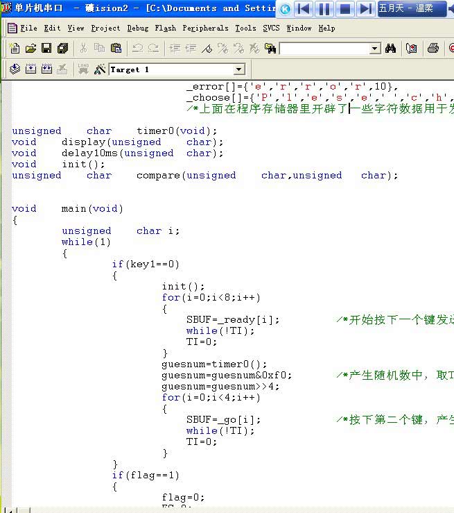這個課程拖了挺久的,從上學期的十幾周開始的。現在的成功也是建立在一款現成的電腦軟件——串口調試助手,本來想自己用C++的MFC編寫的,不過之后的突襲學習C++并沒有達到想要的結果,加上后來考試就拖了下來。不過在單片機方面也系統的學習了串口通信(異步,UART)和程序的編寫方式,實現了兩個單片機之間的通信,至于隨機數的產生,這個是用了定時器,很簡單。