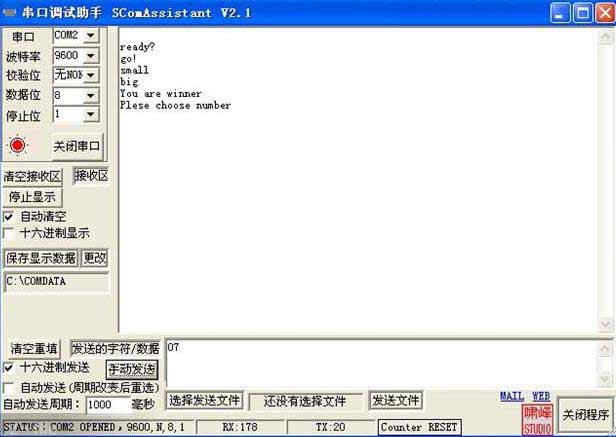 昨天看站長用到串口調試助手,覺得不錯,想下一個,沒想到原來我以前就下過,所以順便就做完了這個猜數字游戲,具體來說,除了電腦上的編程還是很簡單的,應該說是最基礎的,在方式一9600波特率下通信,9位含停止位傳輸,學單片機的是必學的。