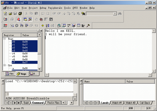 9)調試程序:在上圖中,單擊“Debug”菜單,在下拉菜單中單擊“Go”選項,(或者使用快捷鍵F5),然后再單擊“Debug”菜單,在下拉菜單中單擊“Stop Running”選項(或者使用快捷鍵Esc);再單擊“View”菜單,再在下拉菜單中單擊“Serial Windows #1”選項,就可以看到程序運行后的結果,其結果如下圖所示