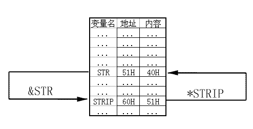 變量的指針就是變量的地址,用取地址運算符‘&’取得賦給指針變量。&STR 就是把 變量 STR 的地址取得。用語句 STRIP = &STR 就能把所取得的 STR 指針存放在 STRIP 指 針變量中。STRIP 的值就變為 51H。可見指針變量的內容是另一個變量的地址,地址所屬的 變量稱為指針變量所指向的變量。