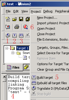 (5)C程序文件已被加到了項目中了,下面就剩下編譯運行了。這個項目只是用做學 習新建程序項目和編譯運行仿真的基本方法,所以使用軟件默認的編譯設置,它不會生成用 于芯片燒寫的 HEX 文件。先來看圖 1-7 吧,圖中 1、2、3 都是編譯按鈕,不一樣是 1 是用 于編譯單個文件。2 是編譯鏈接當前項目,如果先前編譯過一次之后文件沒有做動編輯改動, 這個時候再點擊是不會再次重新編譯的。3 是重新編譯,每點擊一次均會再次編譯鏈接一次,不 管程序是否有改動。在 3 右邊的是停止編譯按鈕,只有點擊了前三個中的任一個,停止按鈕 才會生效。5 是菜單中的它們。在 4 中能看到編譯的錯誤信息和使用的系統(tǒng)資源情況等, 以后我們要查錯就靠它了。6 是有一個小放大鏡的按鈕,這就是開啟\關閉調(diào)試模式的按鈕, 它也存在于菜單 Debug-Start\Stop Debug Session,快捷鍵為 Ctrl+F5。
