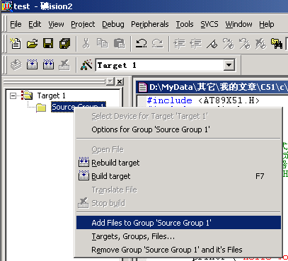 為 test1.c,保存在項目所在的目錄中,這個時候您會發(fā)現(xiàn)程序單詞有了不一樣的顏色,說明 KEIL的C語言語法檢查生效了。如圖 1-6 鼠標在屏幕左邊的 Source Group1 文件夾圖標上右擊彈出 菜單,在這里能做在項目中增加減少文件等操作。選“Add File to Group ‘Source Group 1’” 彈出文件窗口,選擇剛剛保存的文件,按 ADD 按鈕,關閉文件窗,程序文件已加到項目中了。這個時候在 Source Group1 文件夾圖標左邊出現(xiàn)了一個小+號說明,文件組中有了文件,點擊它能展開查看。