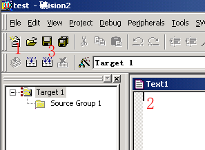 (3)首先在項目中創(chuàng)建新的程序文件或加入舊程序文件。如果您沒有現(xiàn)成的程序,那 么就要新建一個程序文件。在 KEIL 中有一些程序的 Demo,在這里我們還是以一個 C 程序 為例介紹如何新建一個 C 程序和如何加到您的第一個項目中吧。點擊圖 1-5 中 1 的新建文 件的快捷按鈕,在 2 中出現(xiàn)一個新的文字編輯窗口,這個操作也能通過菜單 File-New 或 快捷鍵 Ctrl+N 來實現(xiàn)。好了,現(xiàn)在能編寫程序了。下面是經(jīng)典的一段程序,呵,如果您看過別的程序書也許也有類似的程序: