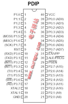 AT89S51有PDIP、PLCC、TQFP三種封裝方式,其中最常見的就是采用40Pin封裝的雙列直接PDIP封裝,外形結構下圖。