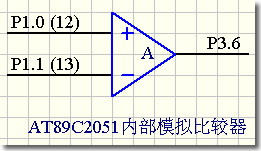 聰明的你一定會發現:標準51單片機有32根可編程I/O口線,89C2051精簡掉P0、P2口16根I/O線后,應該還有16根I/O口線,現在只有15根,另一根跑那里去了呢?!前面講到AT89C2051內部集成了一個模擬比較器,正是因為集成了模擬比較器把另一根引線占用了,比較器的輸出端占用了一個I/O口,它就是P3.6口,引腳P3.6沒有接出來的,所以少一根I/O口線。在編程時,P3.6就只能用來讀比較器的狀態了,不能象其它I/O口一樣用來驅動外部指示燈等設備了,不過模擬比較器很實用的,在開發中就可以省去外加比較器的麻煩,右圖為比較器的原理。 |