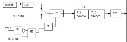 GATE=1,在此種情況下,計(jì)數(shù)脈沖通路上的開(kāi)關(guān)不僅要由TR1來(lái)控制,而且還要受到INT1管腳的控制,只有TR1為1,且INT1管腳也是高電平,開(kāi)關(guān)才合上,計(jì)數(shù)脈沖才得以通過(guò)。這個(gè)特性能用來(lái)測(cè)量一個(gè)信號(hào)的高電平的寬度,想想看,怎么測(cè)?