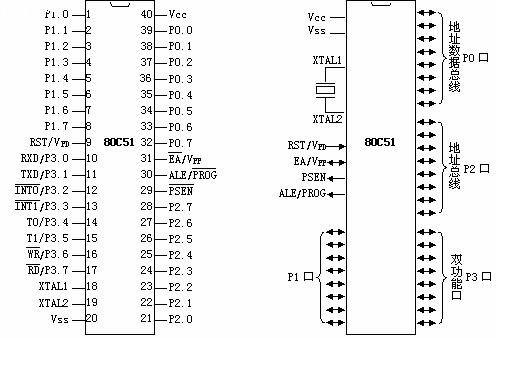 單片機(jī)的40個(gè)引腳大致可分為4類(lèi):電源、時(shí)鐘、控制和I/O引腳。
