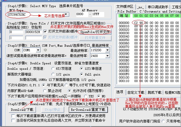 好了…… ,我們把 SETB P1.0 這條匯編語(yǔ)句用keil軟件編譯生成Hex文件,然后用圖3所示的軟件和圖1所示的硬件(用串口連接電腦)下載到我們已經(jīng)做好的電路板上的單片機(jī)芯片里去(圖省事的話建議直接買(mǎi)個(gè)開(kāi)發(fā)板),然后接通電源……什么?燈不亮?這就對(duì)了,因?yàn)槲覀儗?xiě)進(jìn)去的指令就是讓P10輸出高電平,燈當(dāng)然不亮,要是亮就錯(cuò)了。所以要將keil編緝區(qū)的內(nèi)容改為CLR P1.0,重新編譯生成Hex文件,重新下載,接電,好,燈亮了。因?yàn)槲覀儗?xiě)入的Hex就是讓P10輸出低電平的指令。這樣我們看到,硬件電路的連線沒(méi)有做任何改變,只要改變寫(xiě)入單片機(jī)中的內(nèi)容,就能改變電路的輸出效果。