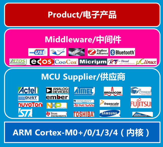 在8bit MCU時代,處理任務簡單,程序容量也小。隨著人對產品功能需求的增加,程序存儲空間越來越大,軟件的任務功能也越來越強。STM32適時而生,滿足了市場需求。MCU從8位到32位的變化,對工程師來說增加了一定的學習難度,而當不同平臺切換時,有需要花時間移植代碼,帶來了不小的工作量。當ARM Corex-Mx成為32位機主流,各大半導體公司都轉投ARM 懷抱時,應用需求變得越來越多樣化,工程師更需要一個統一的穩定的平臺去開發產品,這樣,中間件的需求便應運而生了。隨著經驗和時間驗證,公共平臺(OS及各類開源應用中間件)更趨于成熟,工程師軟件設計更容易、更成熟穩定。基于ARM Cortex-Mx的中間件將會越來越多、軟件開發工具功能也將會增強,使得開發也越來越快。近幾年來,開源社區的發展,在一定程度上豐富了固件/中間件。以此發展下去,ARM Cortex-Mx 將會成發展為大的生態系統。