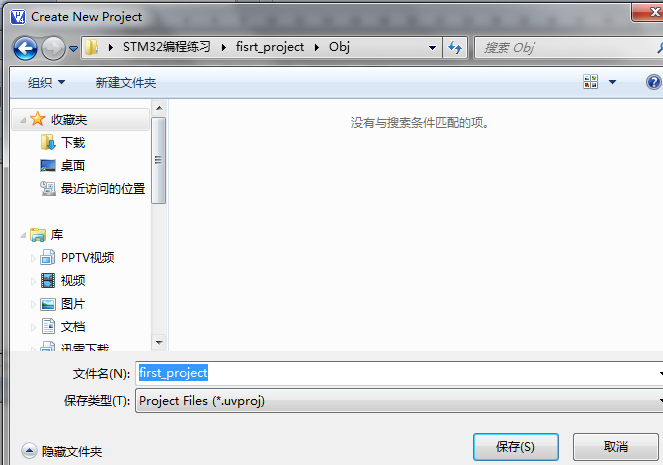 5、保存工程名,選擇Obj文件夾, 文件名為first_project ,不用加后綴格式,系統默認。