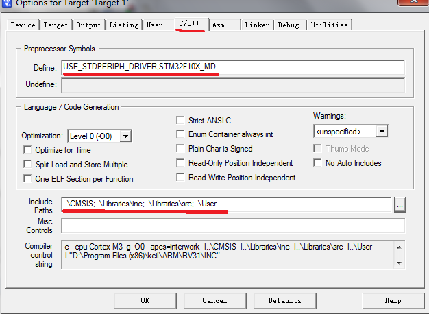 Define:USE_STDPERIPH_DRIVER,STM32F10X_MD,這是預定義的兩個宏定義。
