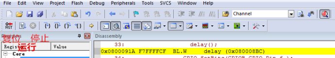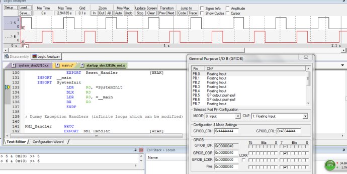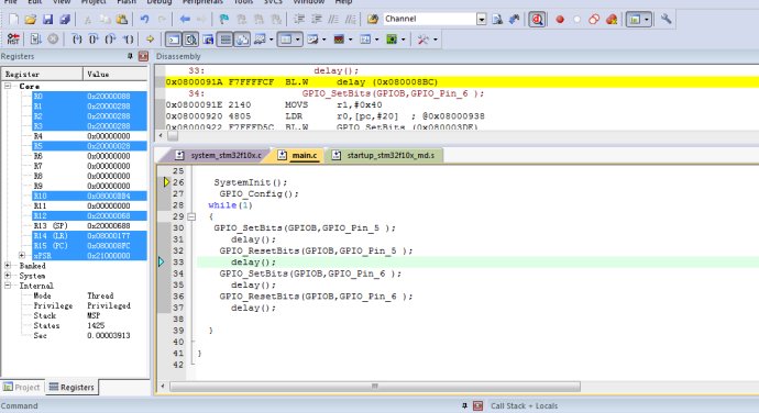 5、點(diǎn)擊左上角的運(yùn)行按鈕 或者按F5鍵 就可以看到GPIOB的5,6 在一閃一閃的
