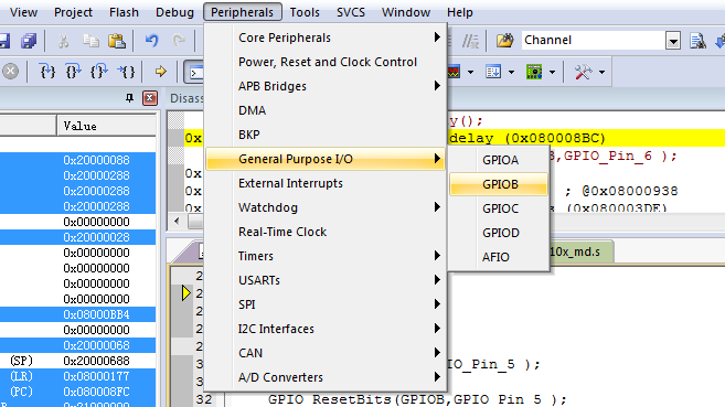 4、選擇菜單欄上的 peripherals 按鈕,選擇general purpose I/O 的GPIOB