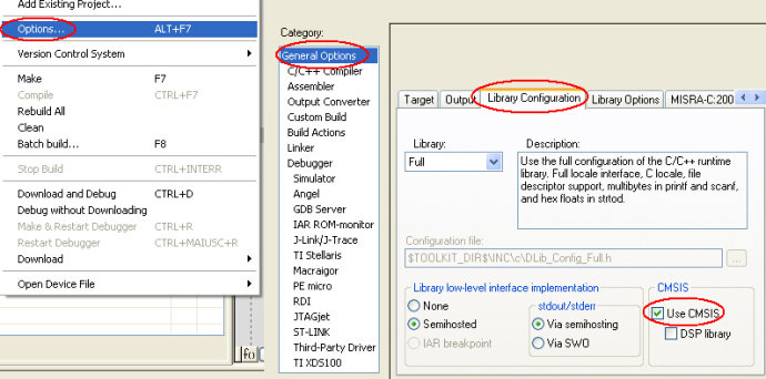 2.進入“option”---“general option”---“Library Configuration”勾選“CMSIS”下的第一個方框,如圖: