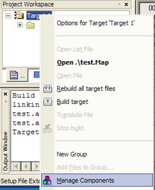 6.在 USER 文件夾下面找到test.Uv2,打開(kāi)它.然后在Target 目錄樹(shù)上右鍵->Manage Components 如圖: