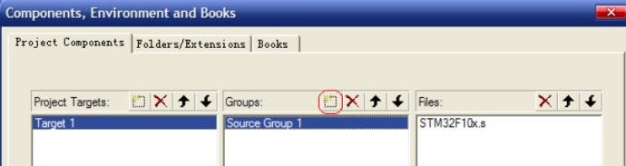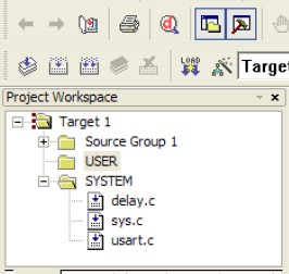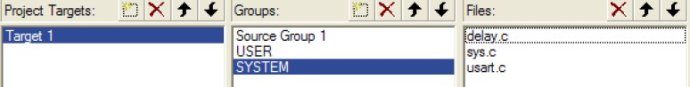8.在上面對(duì)話框的中間欄--雙擊空白處實(shí)現(xiàn),新建USER 和SYSTEM 兩個(gè)組.然后點(diǎn)擊Add Files 按鈕,把sys.c,usart.c,delay.c 加入到SYSTEM組,此時(shí)USER 組下還是沒(méi)有任何文件。如圖: