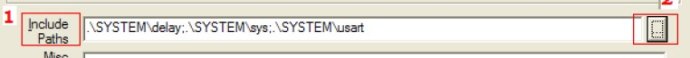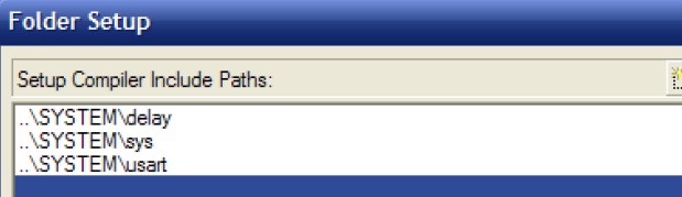 13.在Include Paths 處,點(diǎn)擊2 出的按鈕。在彈出的對(duì)話框中加入SYSTEM 文件夾下的3 個(gè)文件夾,把這幾個(gè)路徑都加進(jìn)去,如圖: