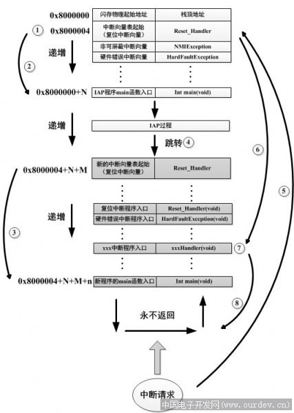 3、 在新程序main函數執行的過程中,一個中斷請求來臨,PC指針仍會回轉至地址為0x8000004中斷向量表處,而并不是新程序的中斷向量表,如圖2中標號○5所示。注意到這是由STM32的硬件機制決定的。