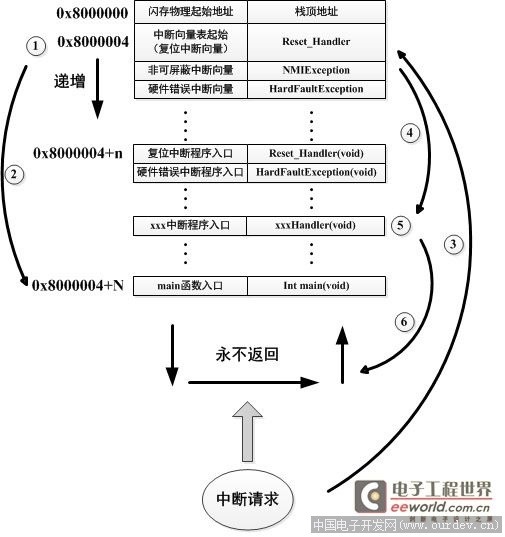 1、 STM32復位后,會從地址為0x8000004處取出復位中斷向量的地址,并跳轉執行復位中斷服務程序,如圖1中標號○1所示。